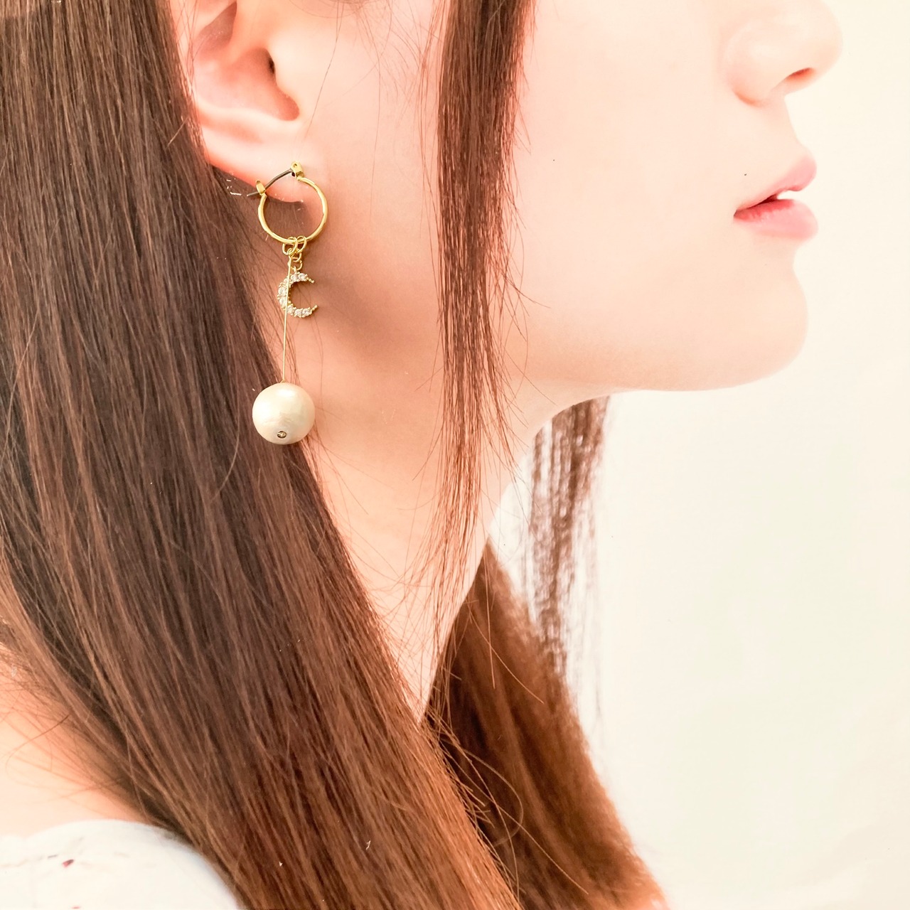 12mmのコットンパールと、ジルコニア付の月とお星さまをフープにぶら下げました。