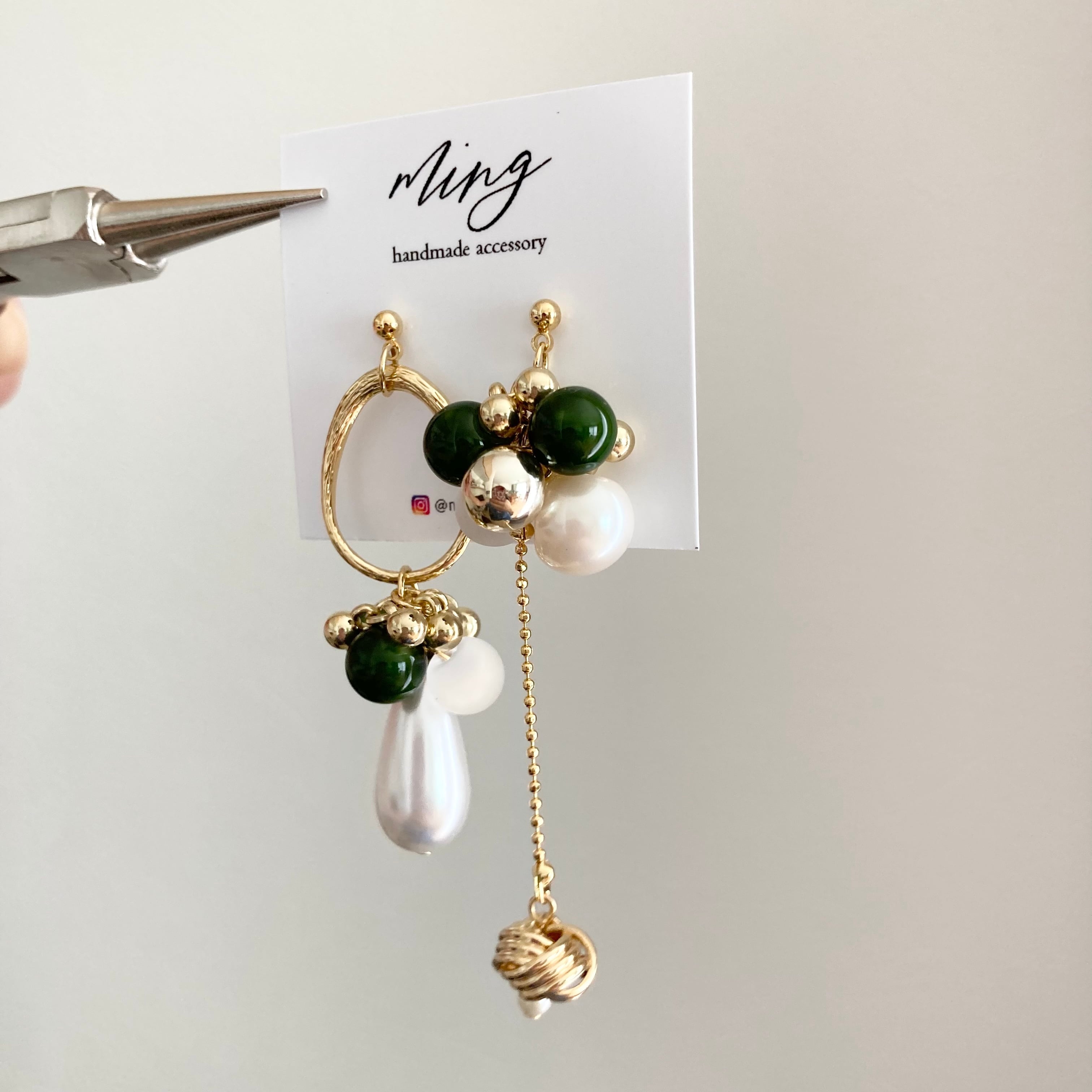 深いグリーン、かすみ、ゴールドの8mmの鈴丸ビーズや、パールを盛り込んだ欲張りデザイン。