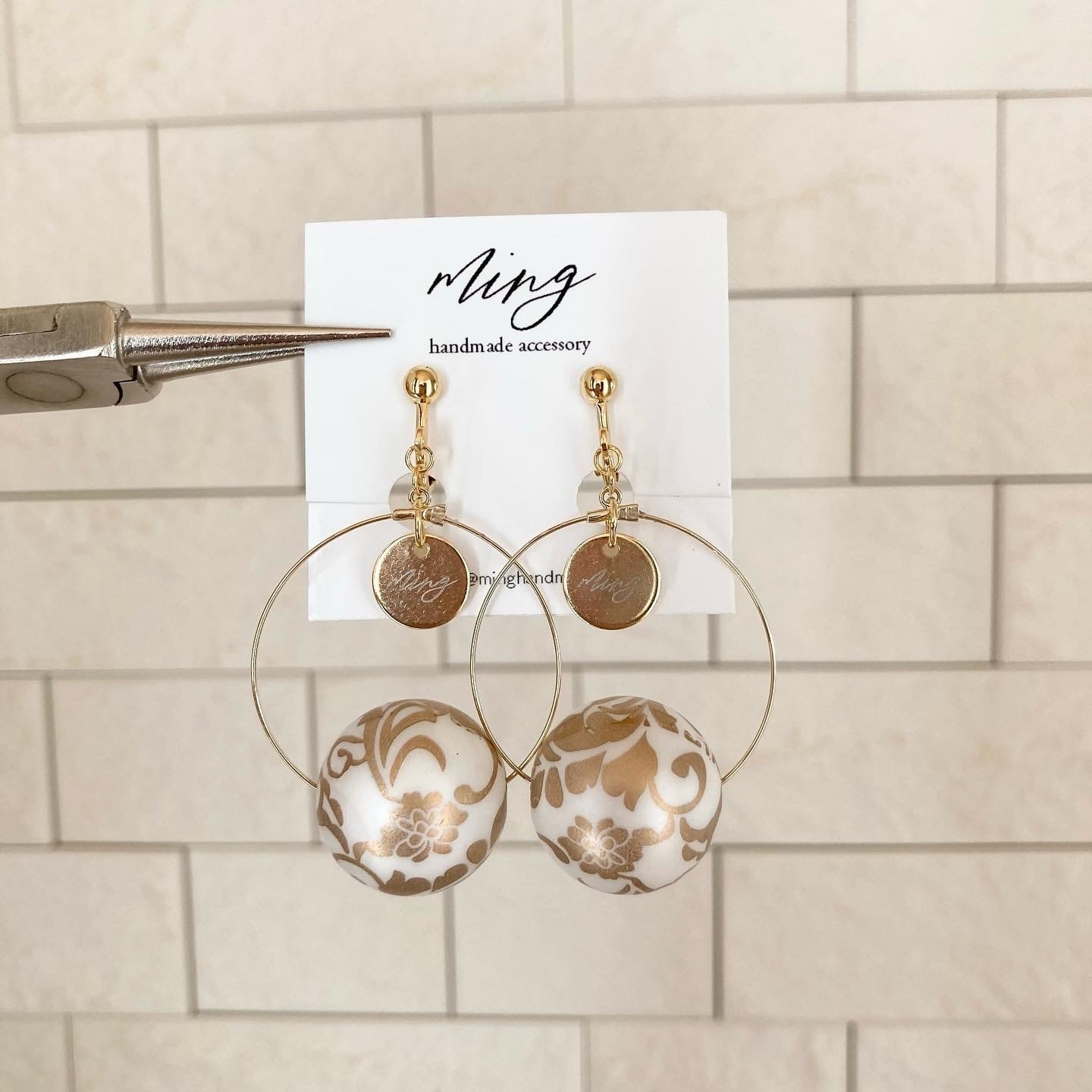 20mmの存在感のあるダマスク柄のビーズを主役に、フープとロゴチャームでシンプルなデザインにしました。
